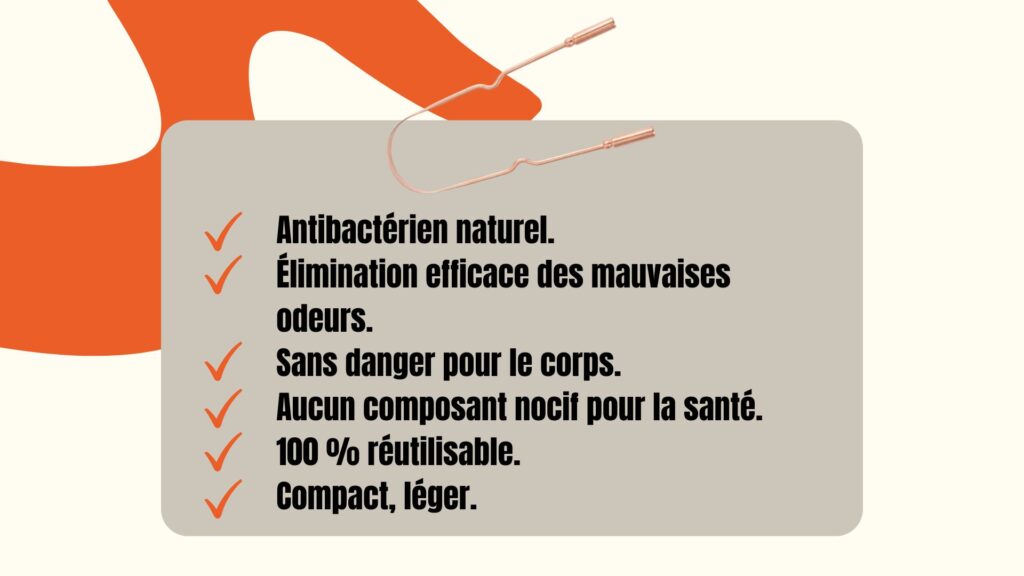 Le cuivre est naturellement antibactérien : il élimine les microbes et garantit un nettoyage ultra-hygiénique, parfait pour notre gratte-langue. Beaucoup d’autres modèles ne sont pas en cuivre, ils ne bloquent pas la prolifération bactérienne et restent donc moins efficaces.